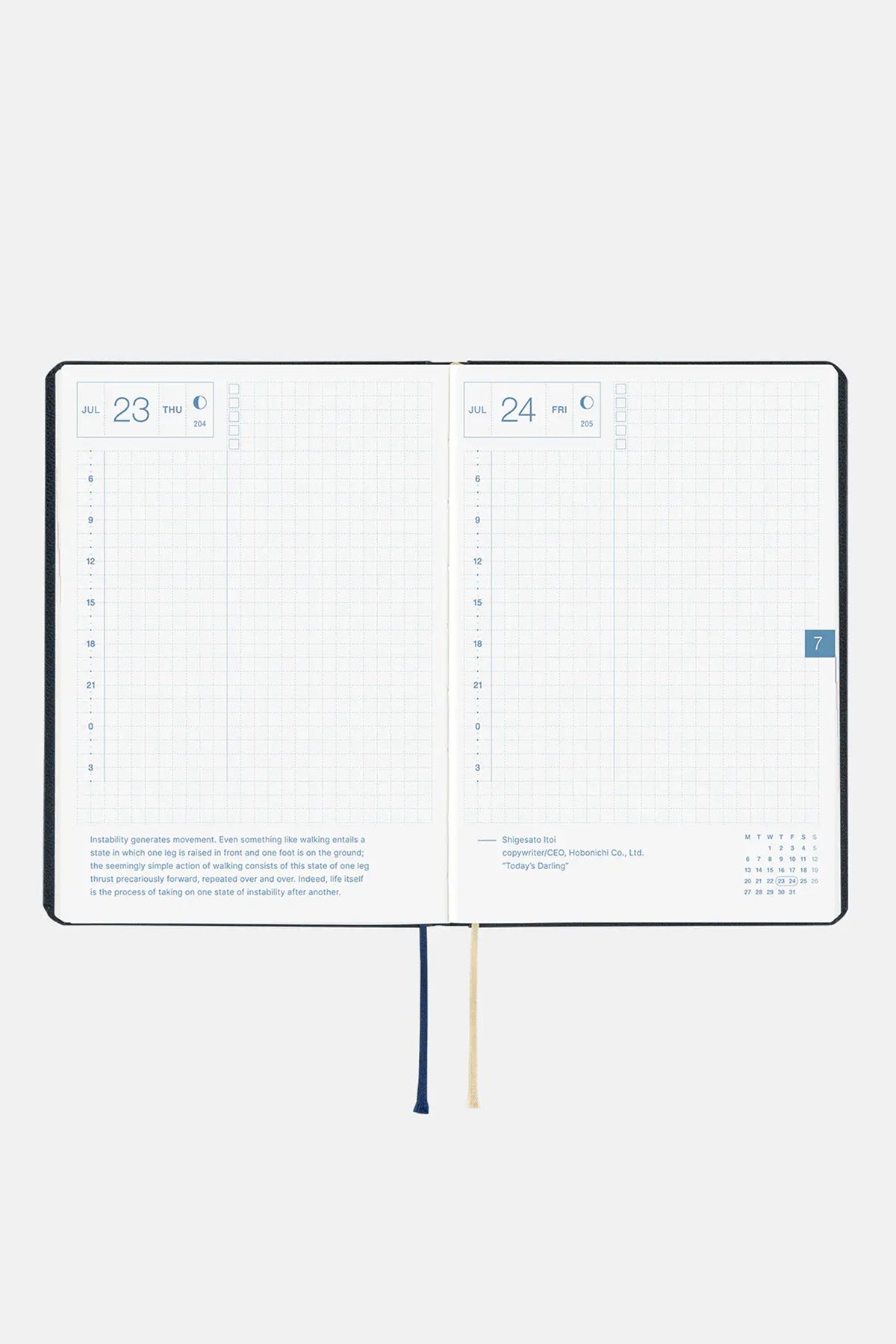 The design is based on the forward-slash symbol ( / ) used when writing dates. The cloth of the cover has a matte texture that feels nice in your hands and is resistant to grime, as well as wear and tear. The book spine is foil-pressed in gold with the year 2025 and the HON logo for easy reference when placed in your bookshelf alongside other books.