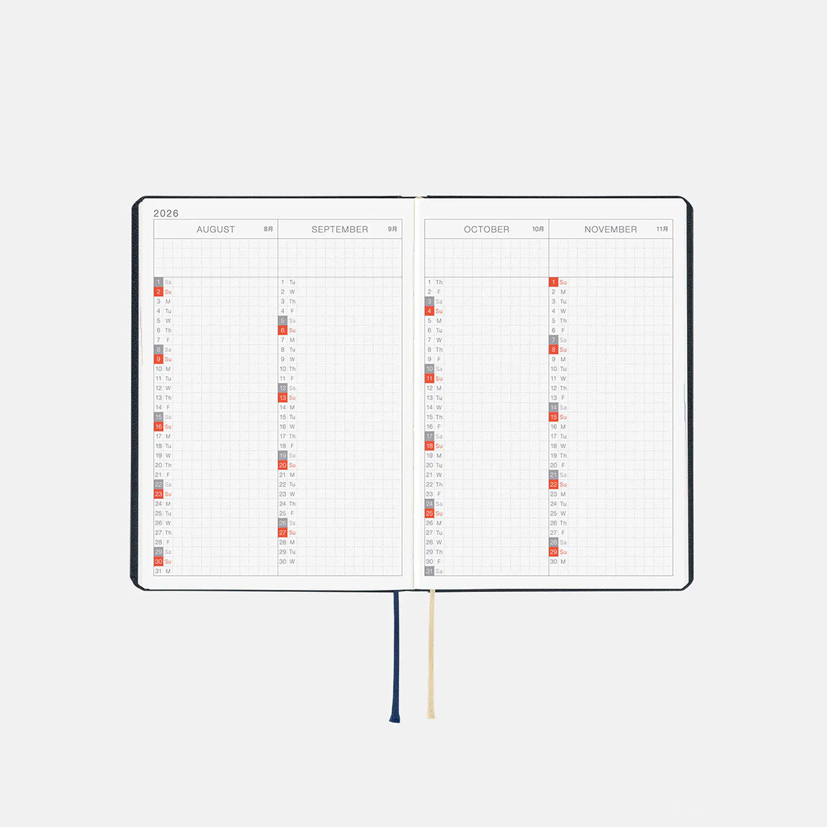 • Bonus pages: Time Table / Graph Paper / Favorites / My 100 / Memories 2026 / 12 Switches to Help You Focus / For a Comfortable Night’s Sleep / Words to Remember / 365 Days Check-Off Sheet / Looking Back at the Year 2026 / Getting the Most Out of Your Hobonichi Techo / Gifts / Addresses / Personal Notes