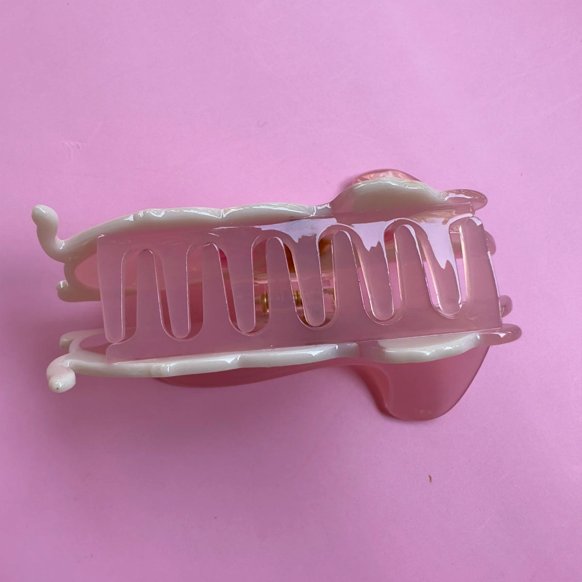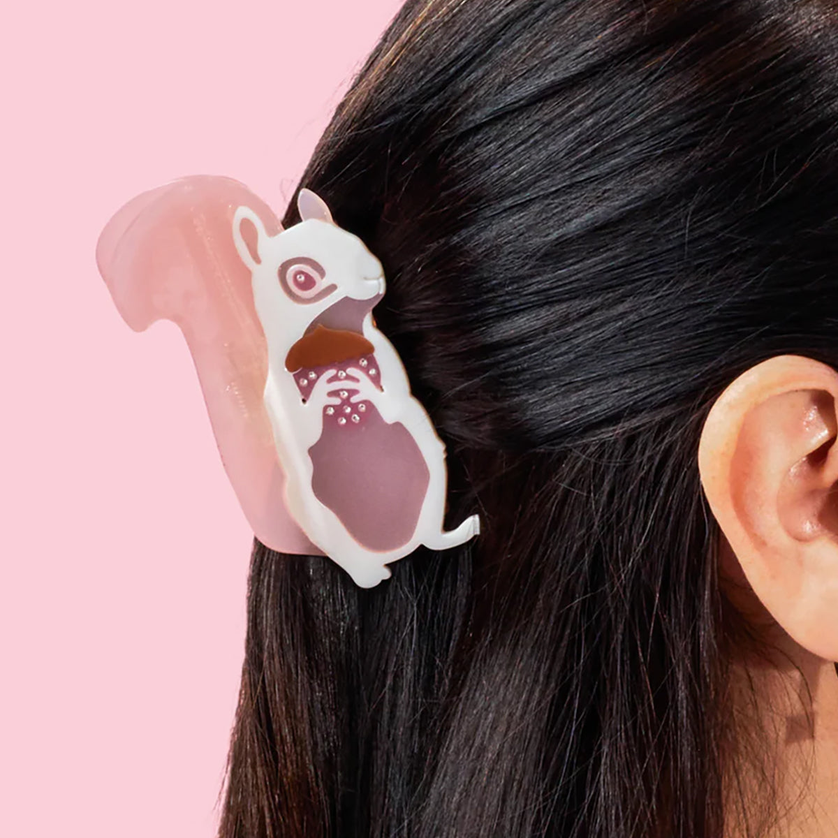 There's a squirrel in your hair! This hair claw is designed to look like an albino squirrel. Check out that rhinestone studded acorn, sure to catch the light when you move.