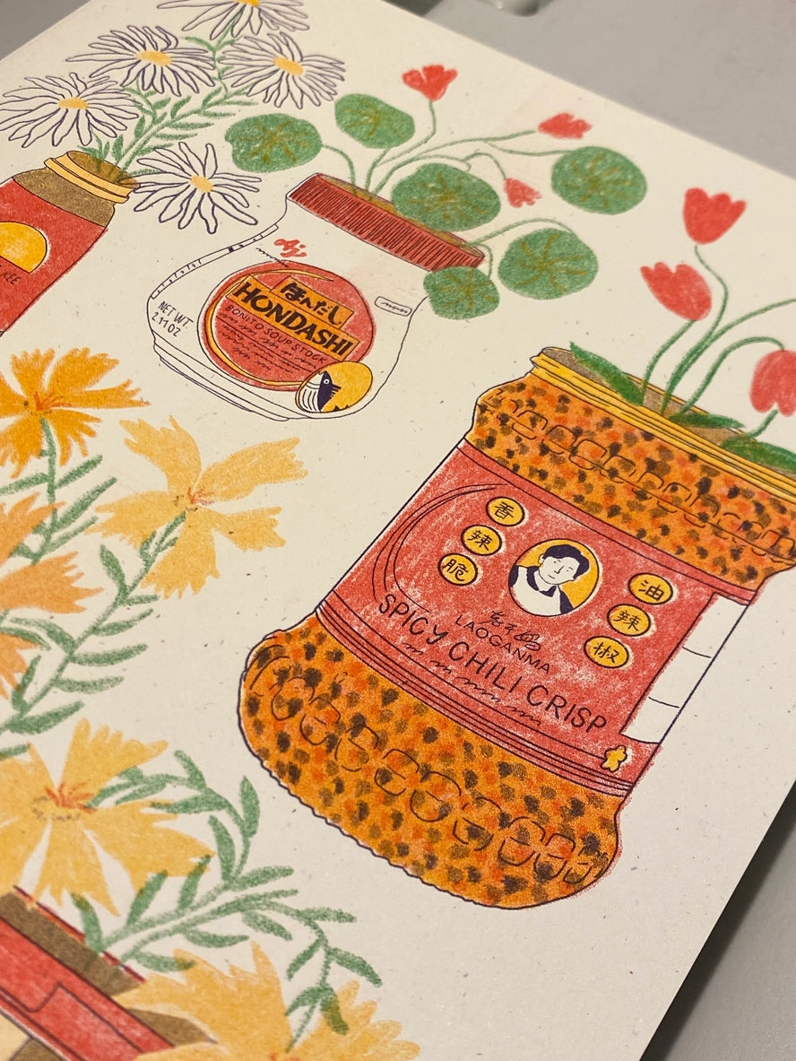 A risograph print from Philly artist and pal Maddy Conover, featuring pantry essentials.