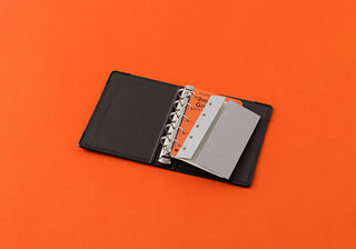 This is the A5 size of PLOTTER's 6-Ring Leather Binder in black Pueblo leather. It pairs with compatible A5 notebook refills and accessories to expand your creativity, inspire new ideas, and envision the future.