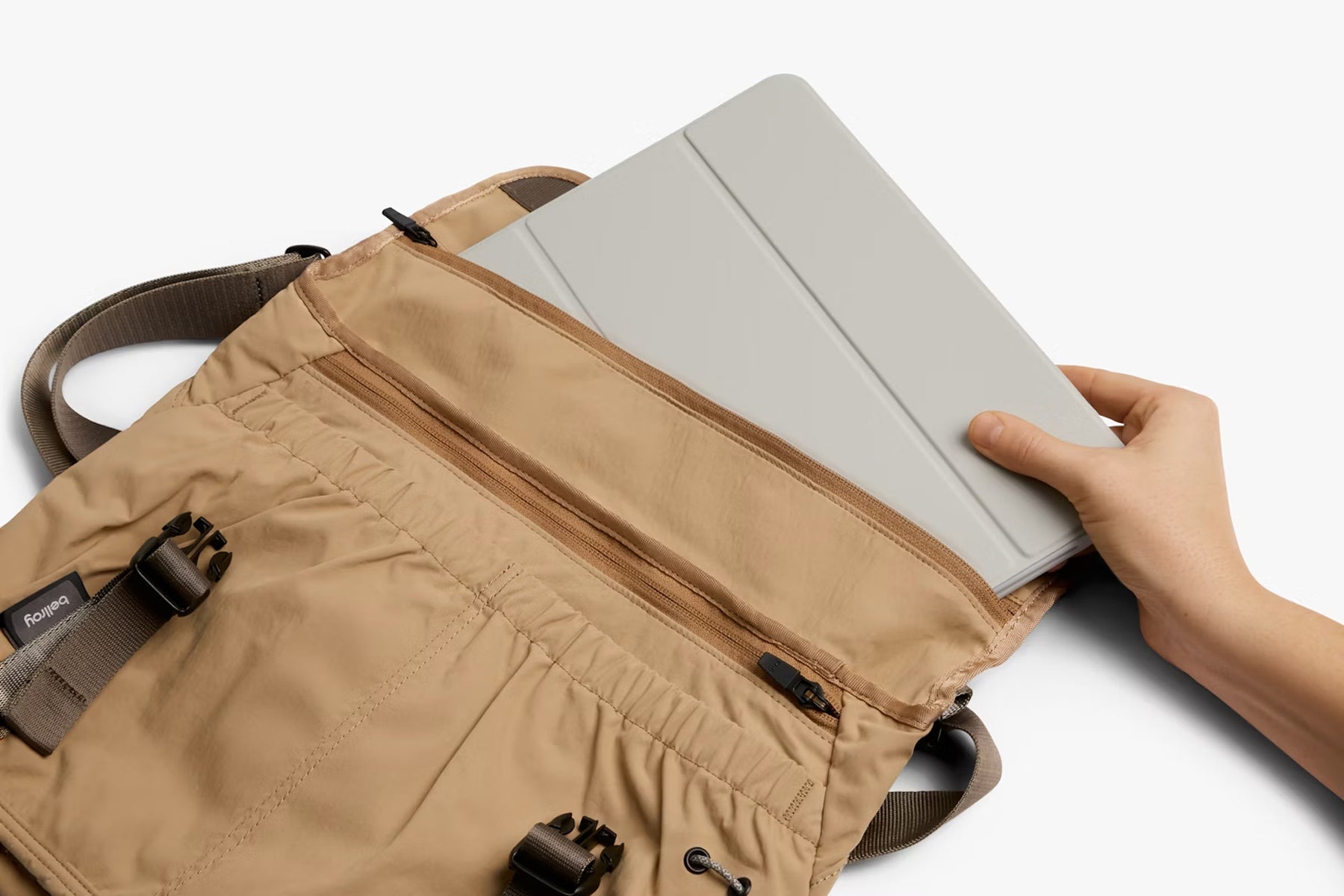 - Dual exterior stretch pockets with elastic gathers and key hook