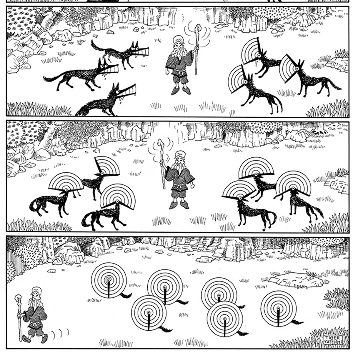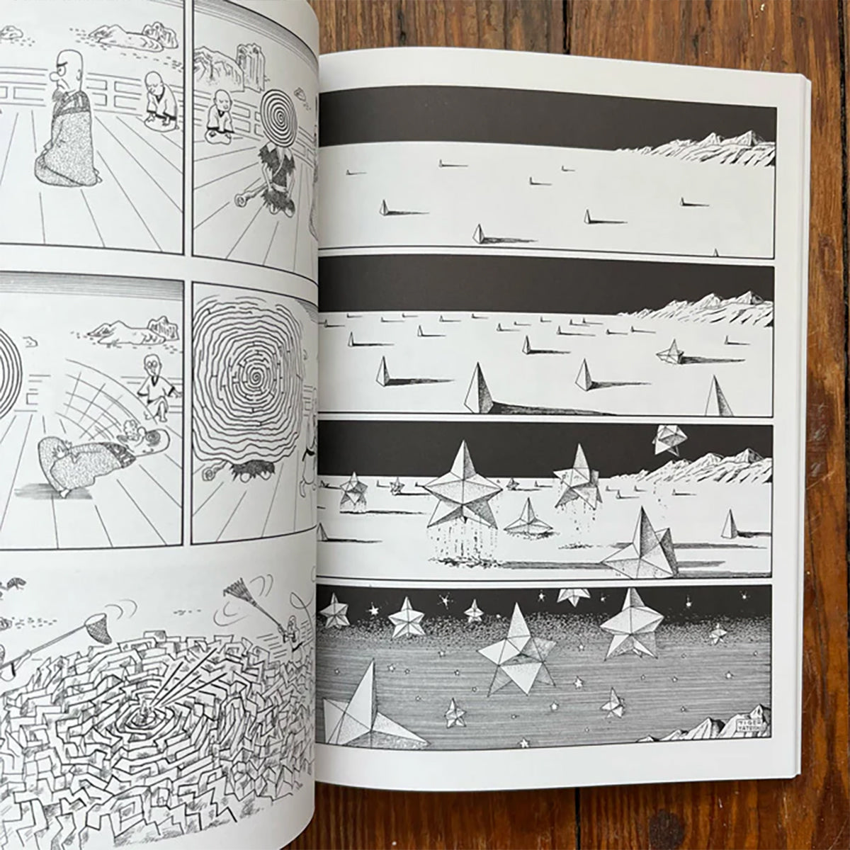 Tiger Tateishi first began drawing cartoons in 1964, inspired by copies of MAD Magazine which occupation forces had left behind. Before moving to Milan in 1969, Tateishi regularly contributed to manga magazines. In Milan, while working for Ettore Sottsass at Olivetti, he began creating the stunning comic panel layout paintings posthumously collected in the book Moon Trax.