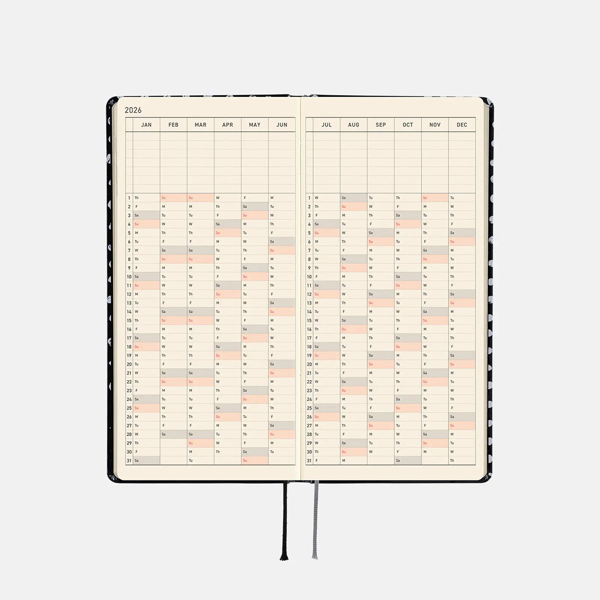 It opens 180 degrees onto the table. It stays flat even if you don’t hold it down. The book uses thin and light yet durable Tomoe River paper. It's characterized by its ability to hold ink well and provide a smooth writing experience.