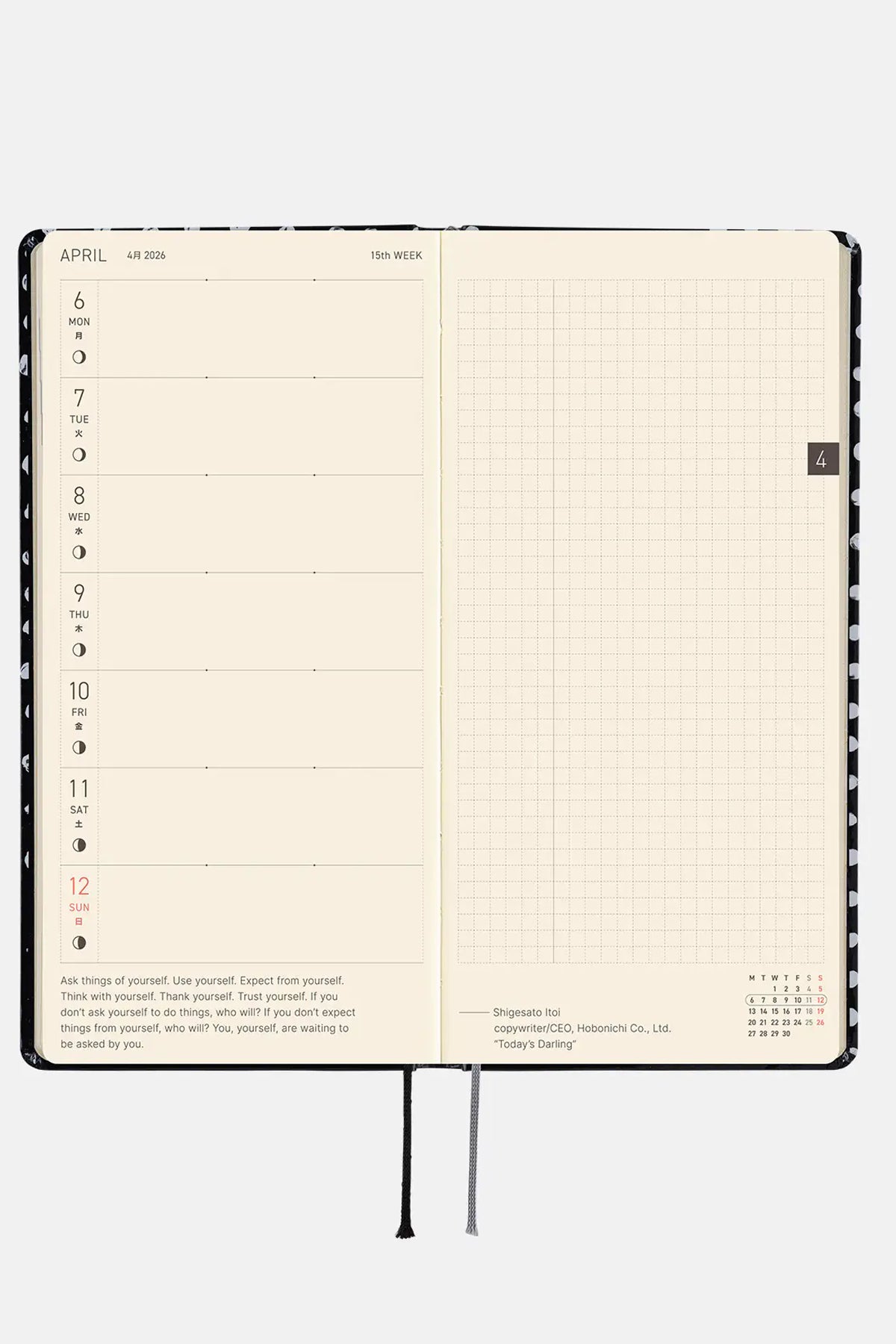 This Weeks features a drawing by printmaker and artist Makoto Matsubayashi, who is based in Kochi Prefecture. The cover has a glossy finish that enhances the contrast between the black and white, giving the design both a refined and playful feel.