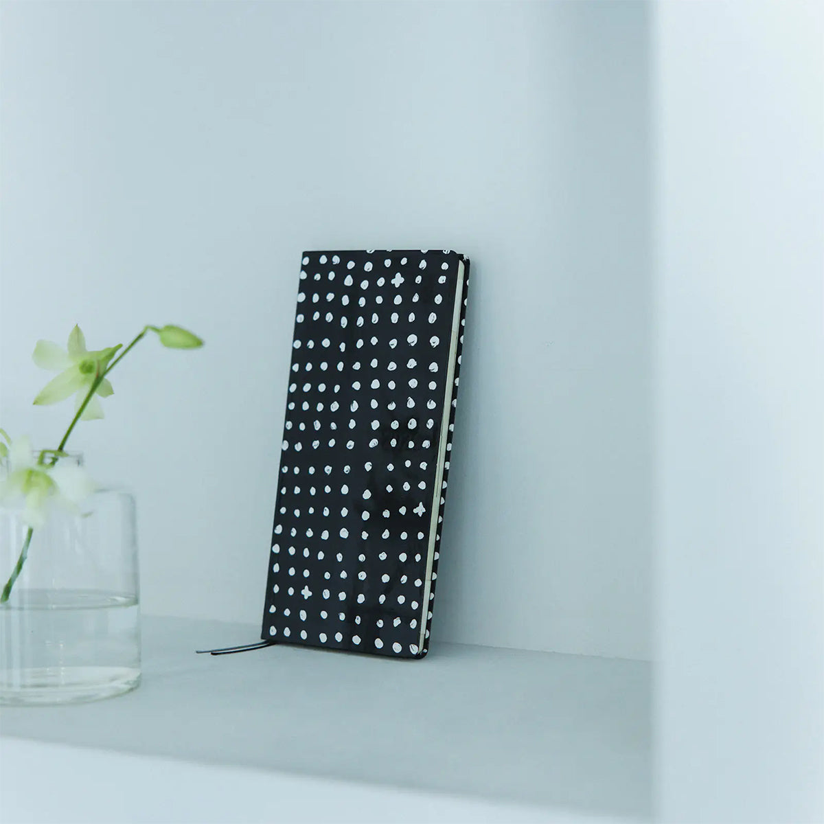 Painted with free-flowing brushstrokes, white dots stand out boldly against a black background. Though the design is refreshingly simple, with no extra embellishment, the subtle wavering and fading of the hand-drawn lines bring a gentle warmth to the overall look.
