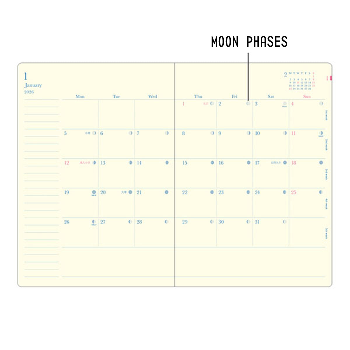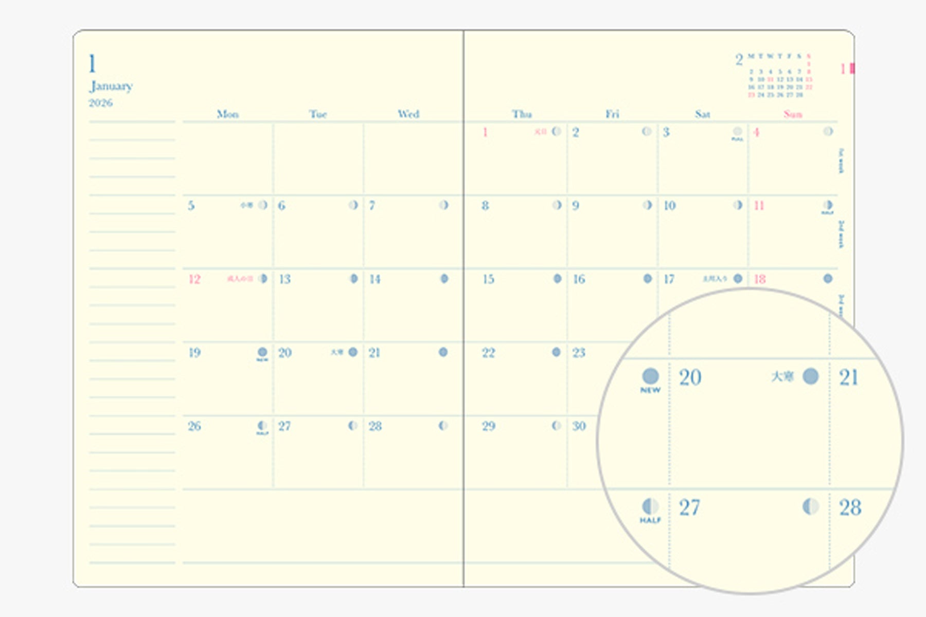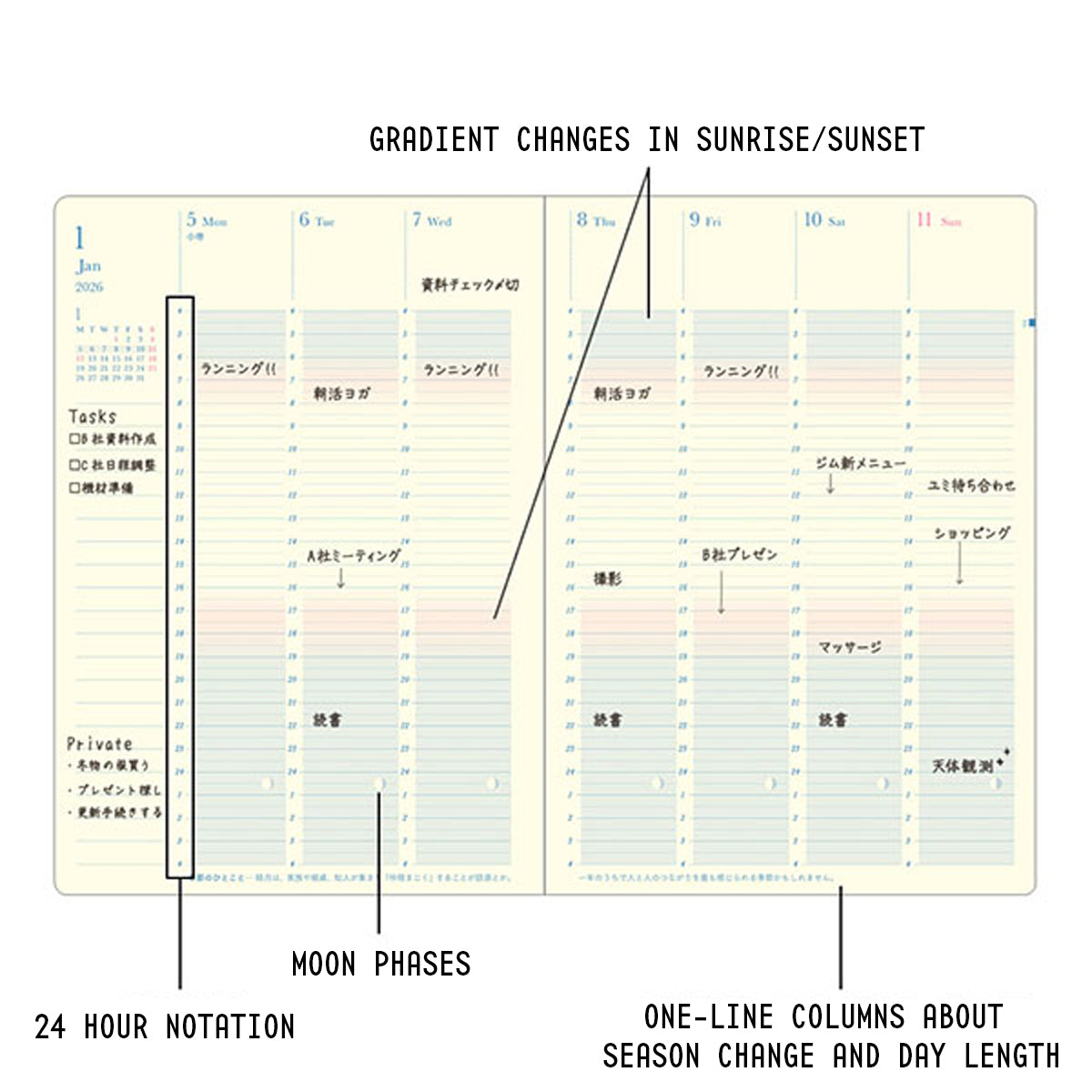 * Note: This is a non-international, Japanese-version planner. Moon phases may be one day ahead of your local time, and, most importantly, it's worth knowing that Japan does not observe Daylight Savings Time. We and our customers find these differences largely unobtrusive in the planner's overall functionality.