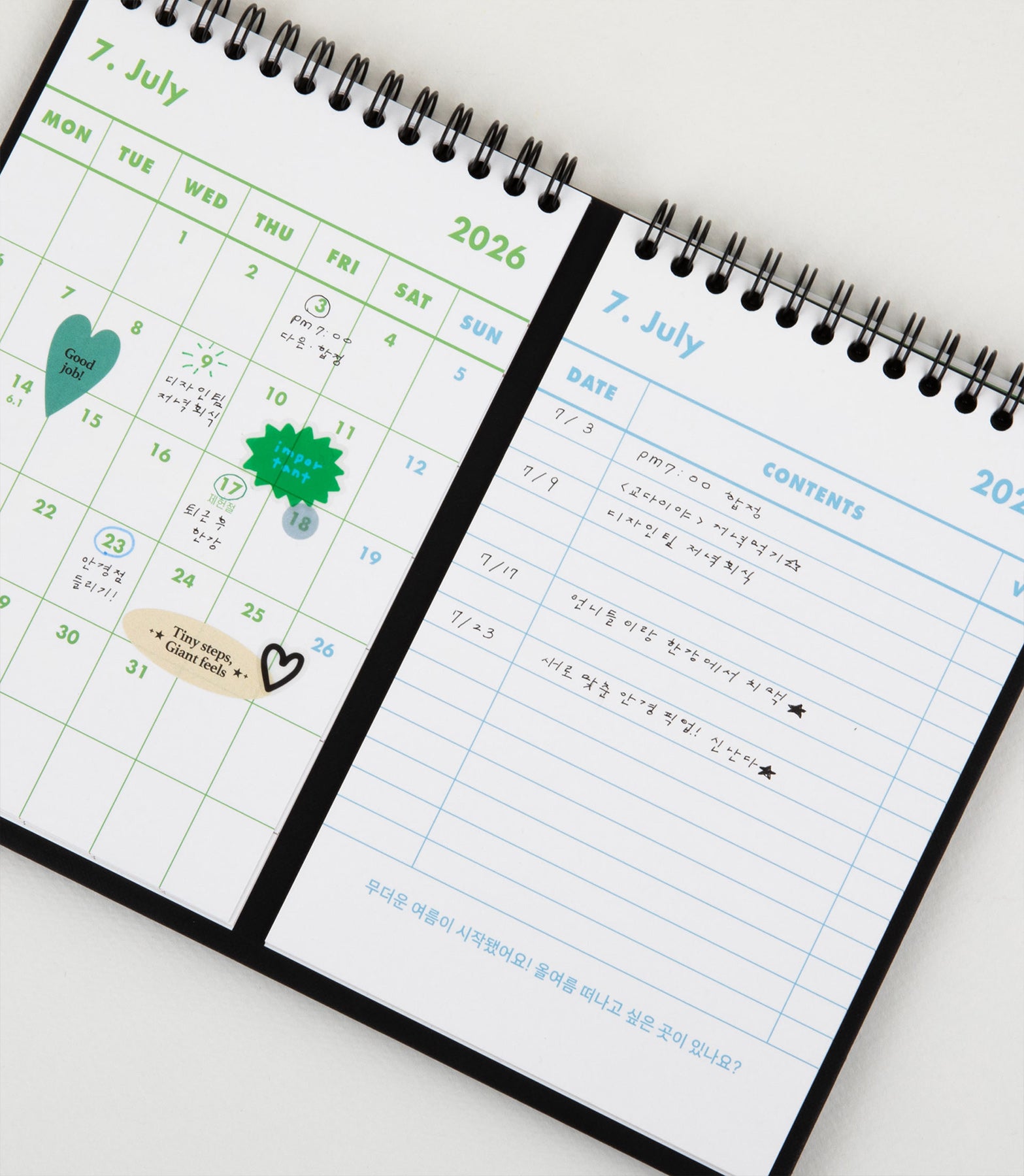 • Includes 2026-2027 year-at-a-glance, monthly views, monthly checklist