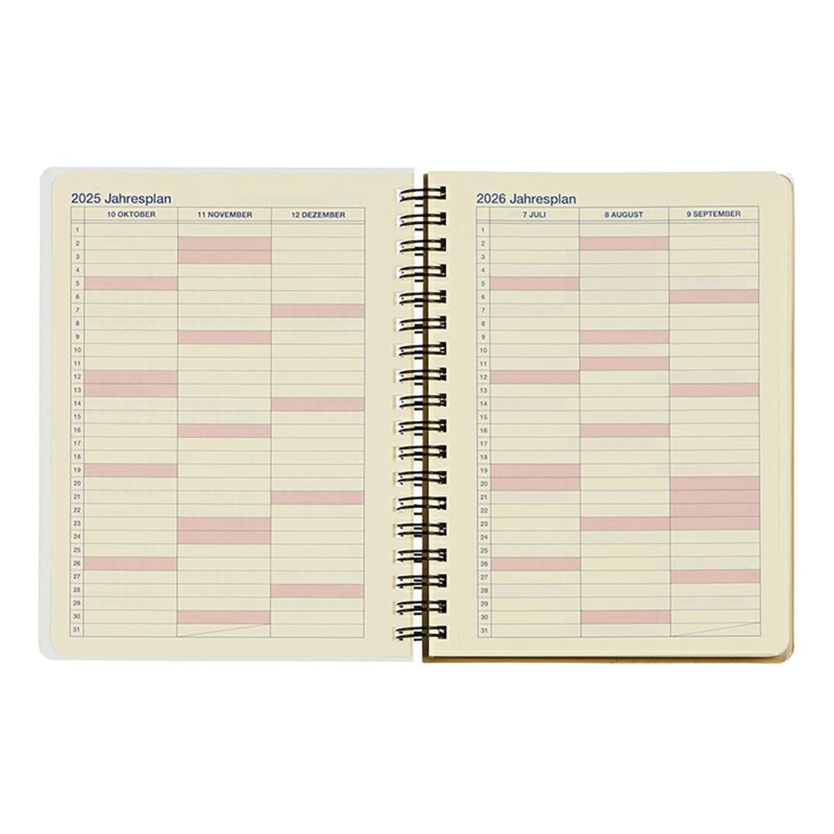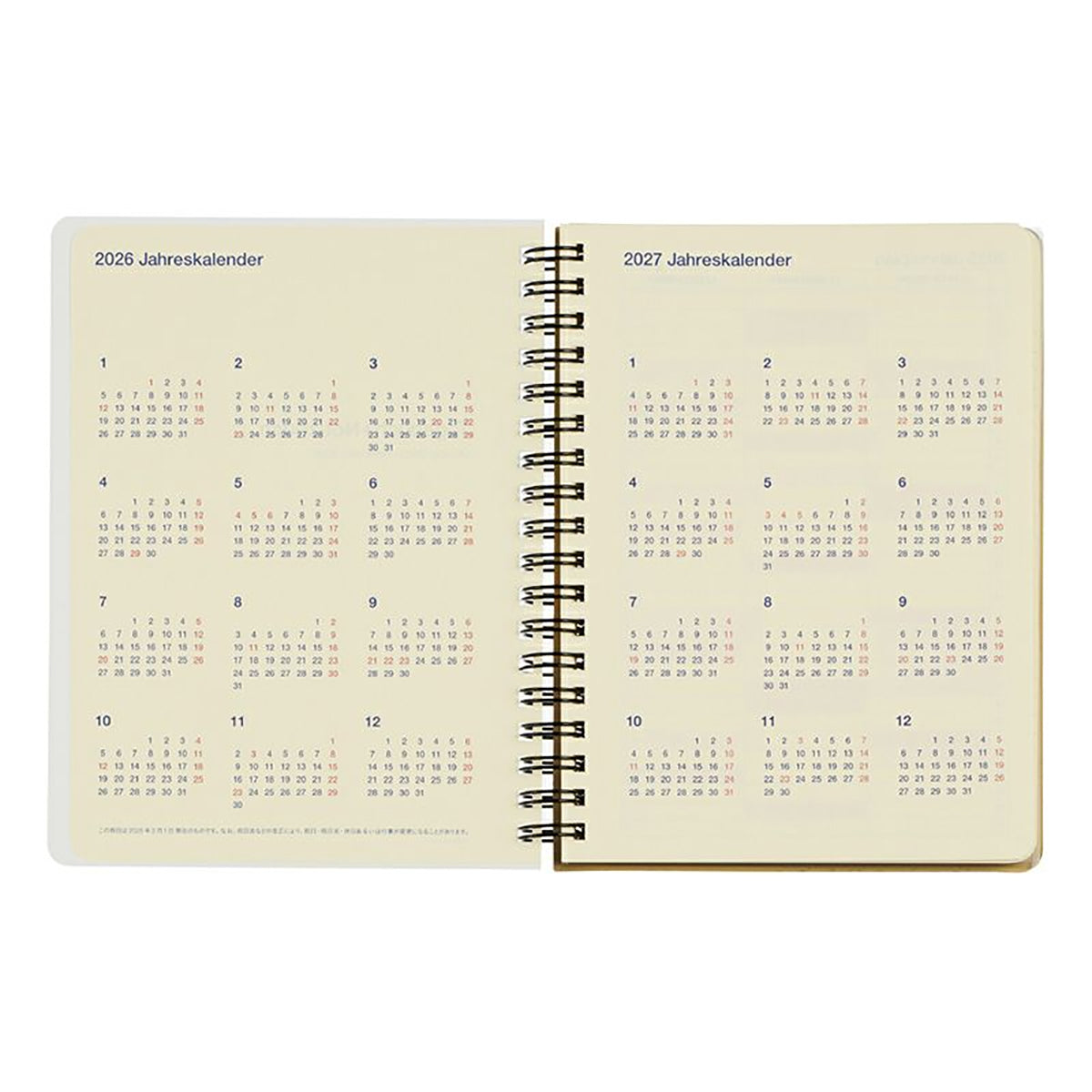 The popular L size, similar to B6, offers a simple monthly layout with a two-page monthly calendar and memo pages. Open the cover to find a title page, yearly calendar, yearly schedule, monthly page, grid memo pages, and clear pockets.