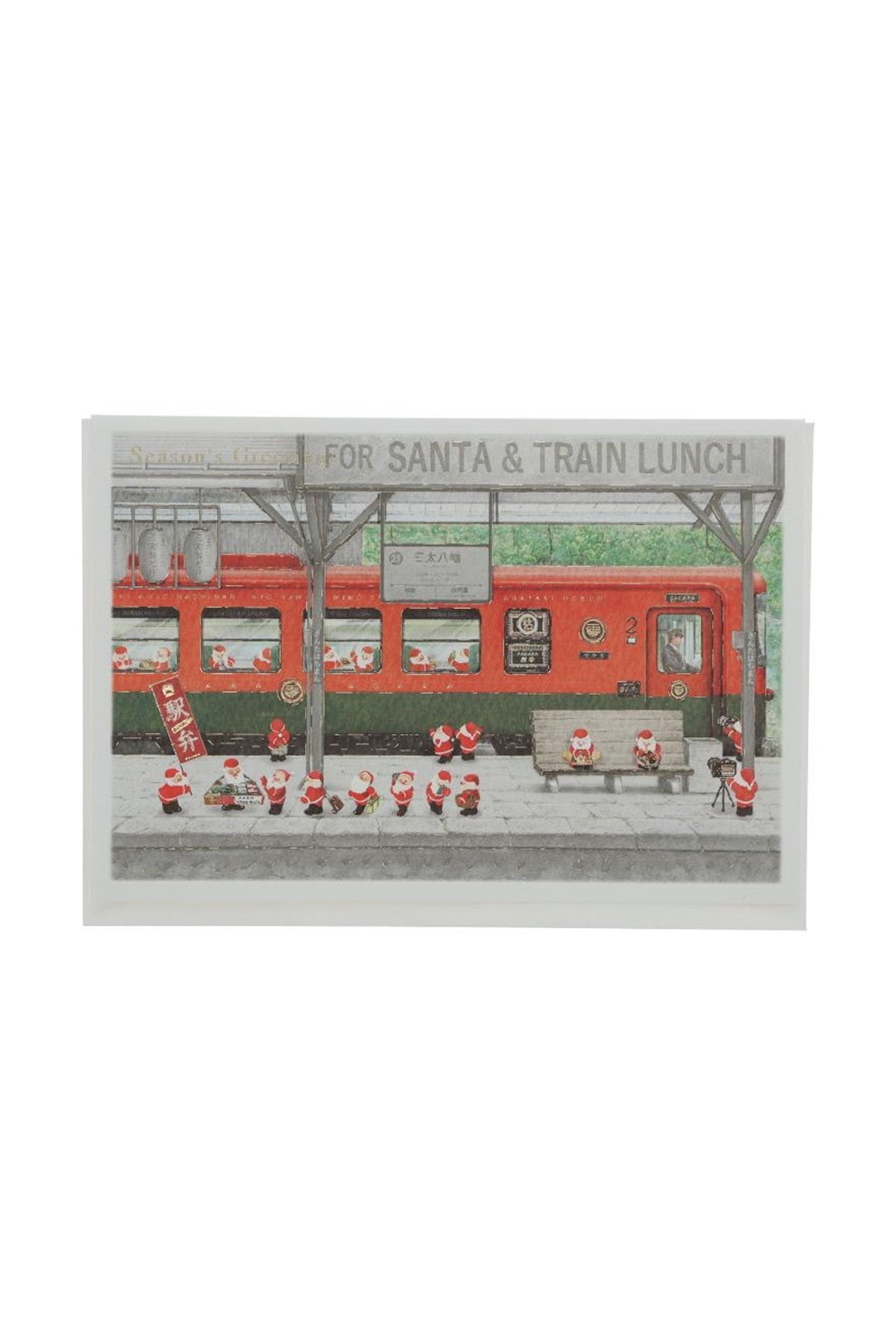 These adorable mini santas are enjoying bentos at the train station.