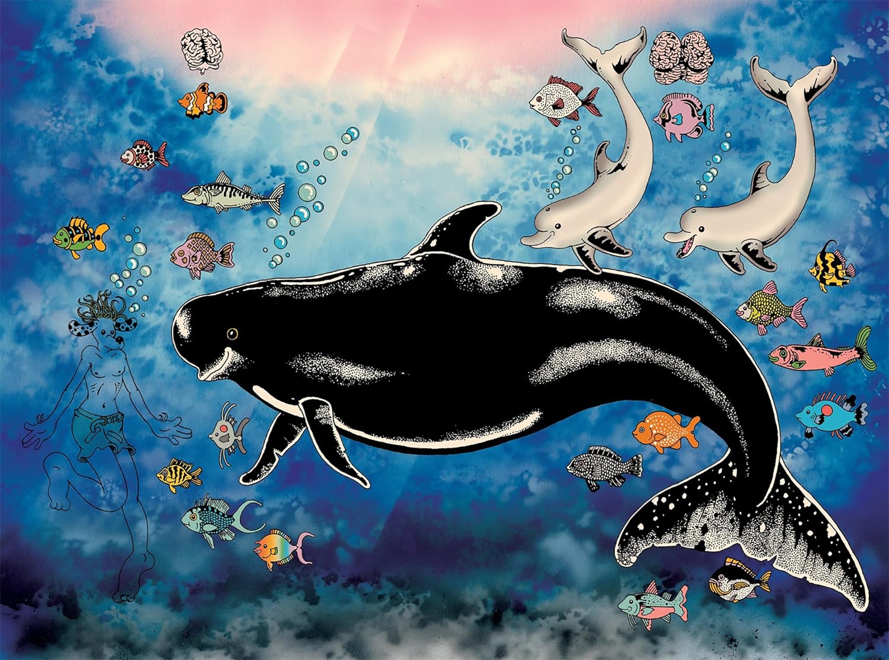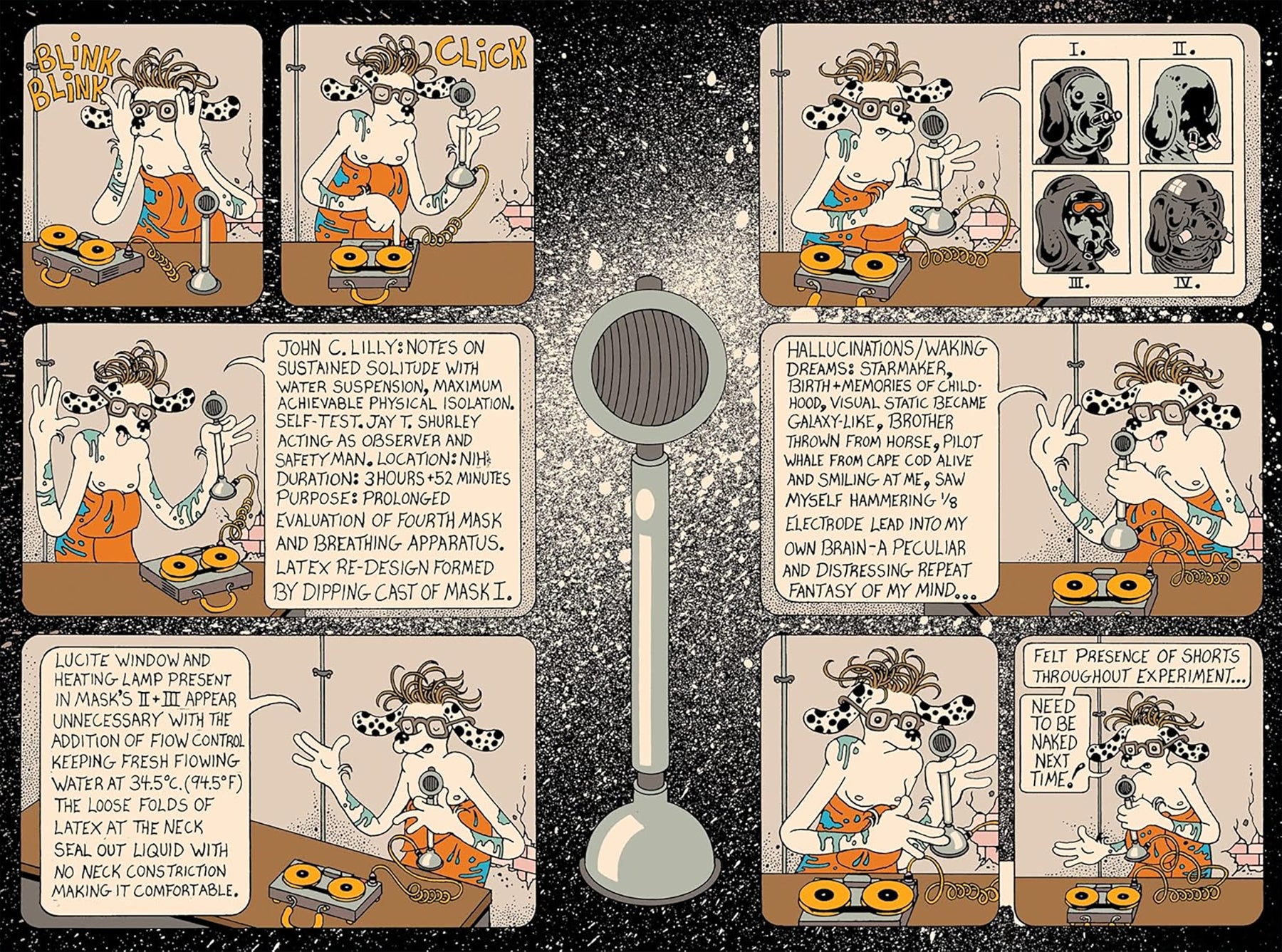 Since 2019, graphic novelist Brian Blomerth’s stunningly original comix histories have combined detailed research and riotous visual wit to illuminate the discovery of LSD (in Brian Blomerth’s Bicycle Day) and the popularization of psilocybin mushrooms (in Brian Blomerth’s Mycelium Wassonii). Now, in the third entry in his ongoing series, Blomerth opens a porthole on the life, experiments, and addictions of John C. Lilly—the man whose development of the isolation tank, controversial studies in dolphin cognition, and ketamine-fueled dives into the nature of consciousness made him perhaps the most notorious researcher of the psychedelic era. Featuring alien visitations, interspecies encounters, and no shortage of concerned onlookers, Brian Blomerth’s Lilly Wave sees a beloved artist working from an expanded palette of industrial ink-splatter and oceanic airbrushing to bring readers a story that’s equal parts cosmic and paranoid, transcendent and tragic.