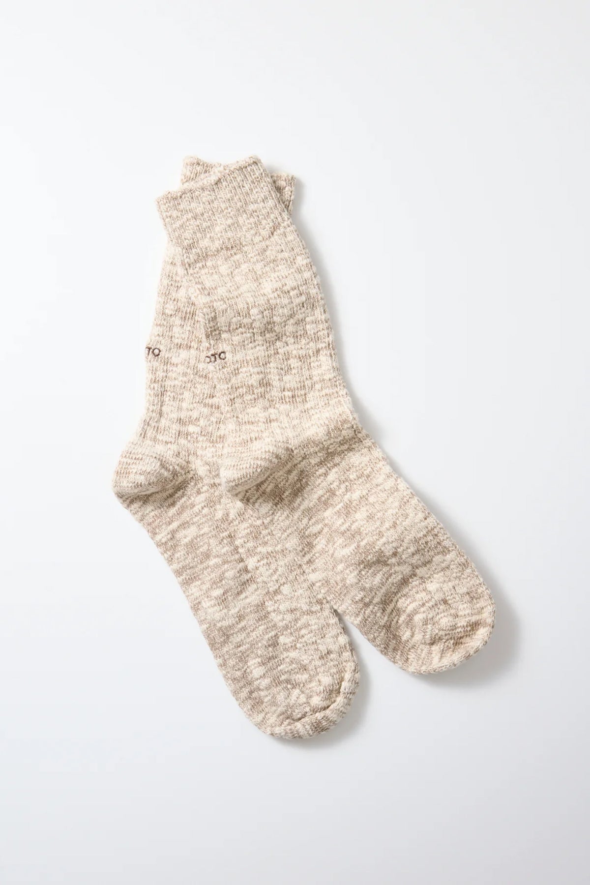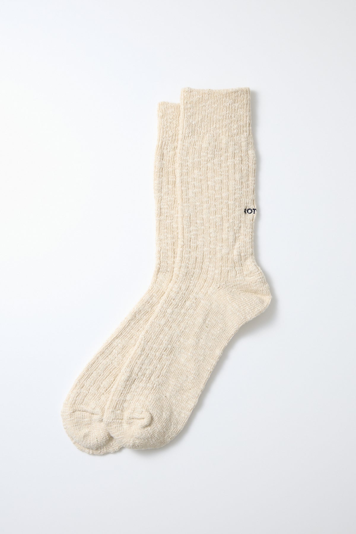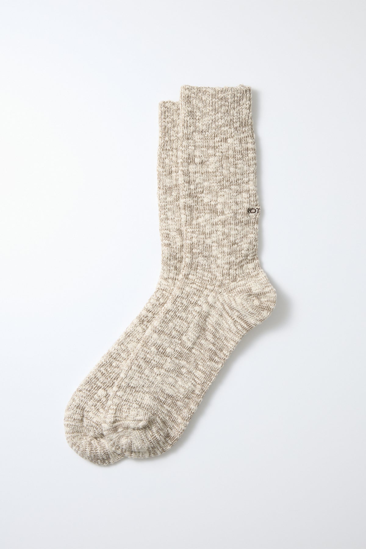 These slub socks combine two types of yarn to create a melange-like texture that resists visible dirt and pilling, even with repeated wear. The base is made from environmentally conscious organic cotton, while the slub yarn is an original blend developed in collaboration with a Japanese spinning mill using organic cotton.