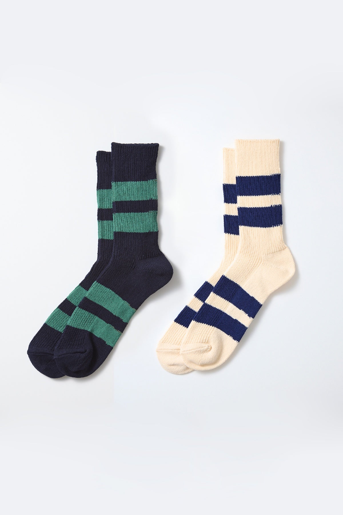 Low-gauge socks featuring a bold 1x1 rib and four distinctive stripes. Made from recycled cotton spun from unused short fibers—known as “fallen cotton”—collected at spinning mills in Japan. The yarn is tightly twisted for a dry, crisp texture and a comfortable fit.