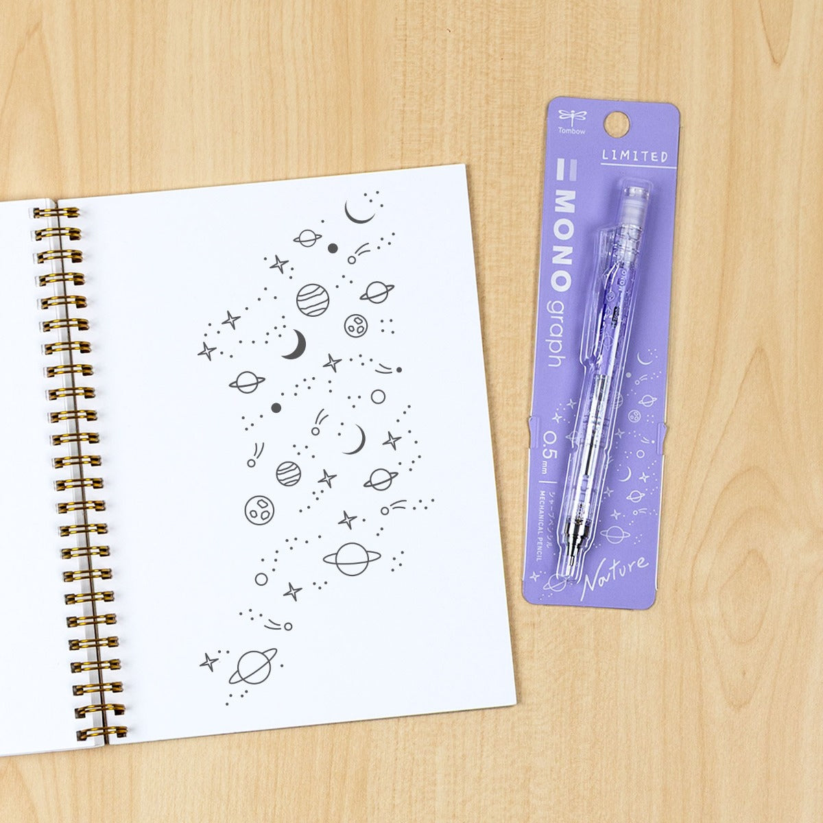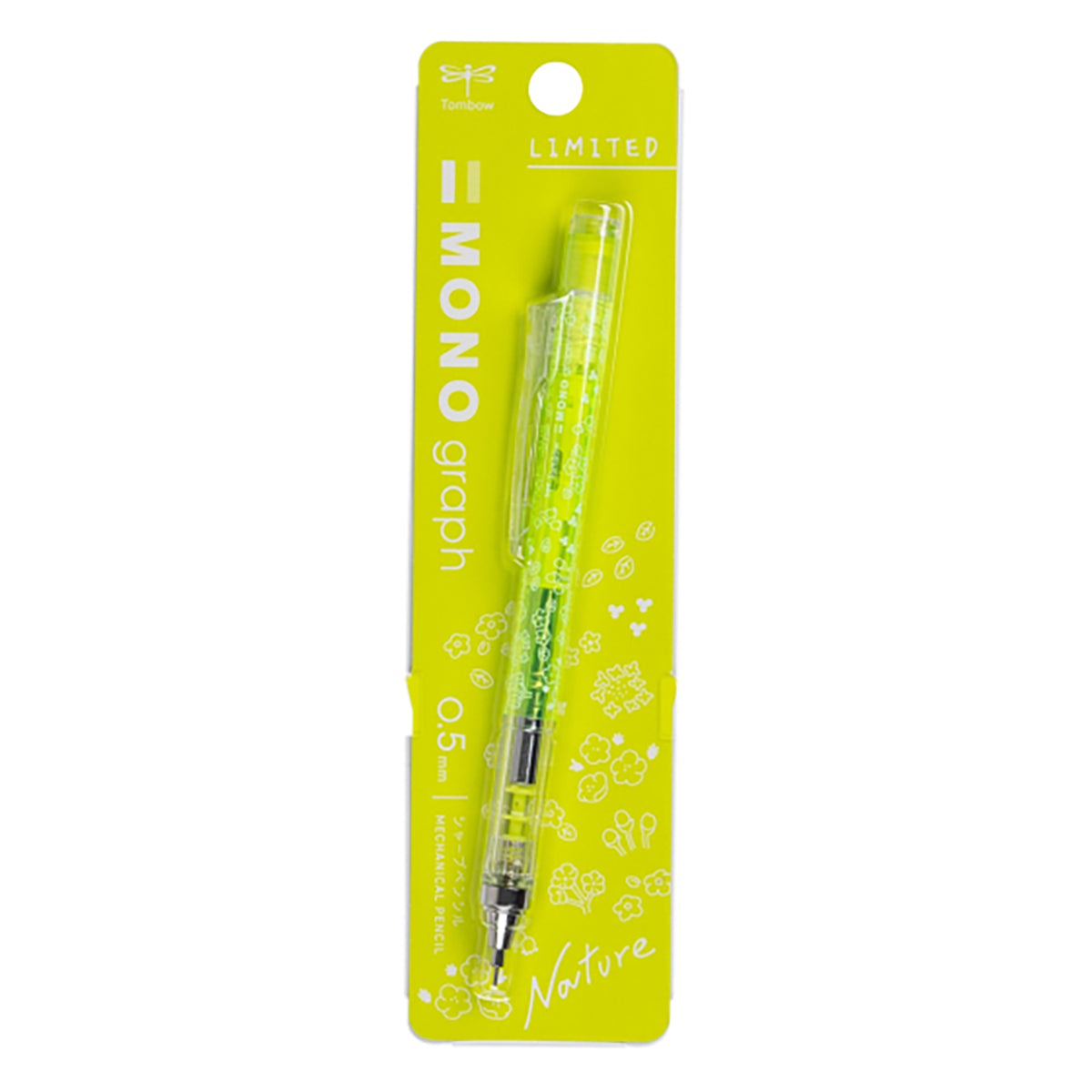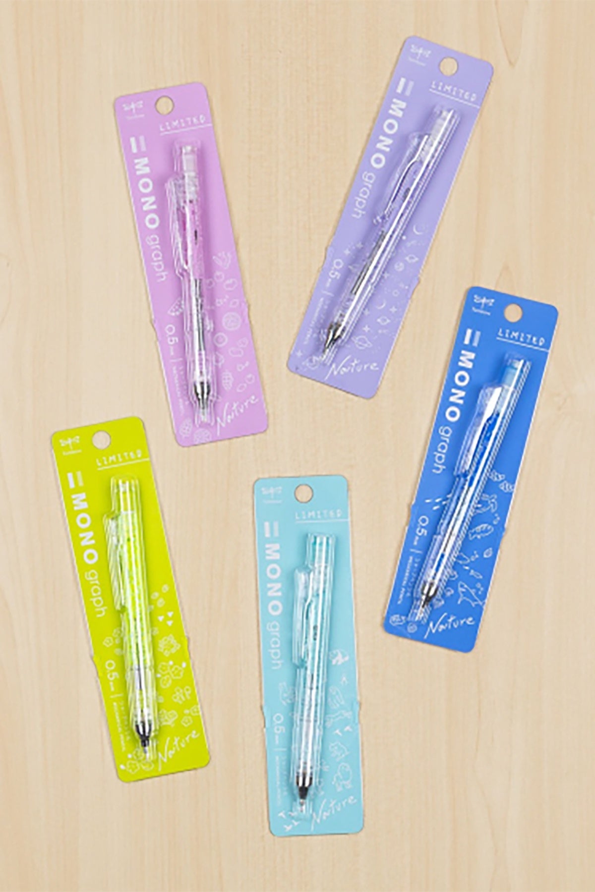 Limited Edition MONO Graph Nature mechanical pencil series featuring delightful nature-themed doodles on the barrel. Each pencil showcases a unique design inspired by the natural world: Animal, Botanical, Fruit, Ocean, and Planet.