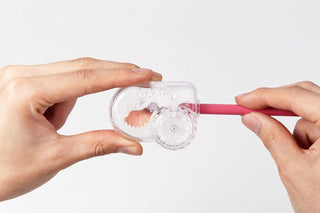 White pencil sharpener with a red and black dog illustration on a colorful geometric background
