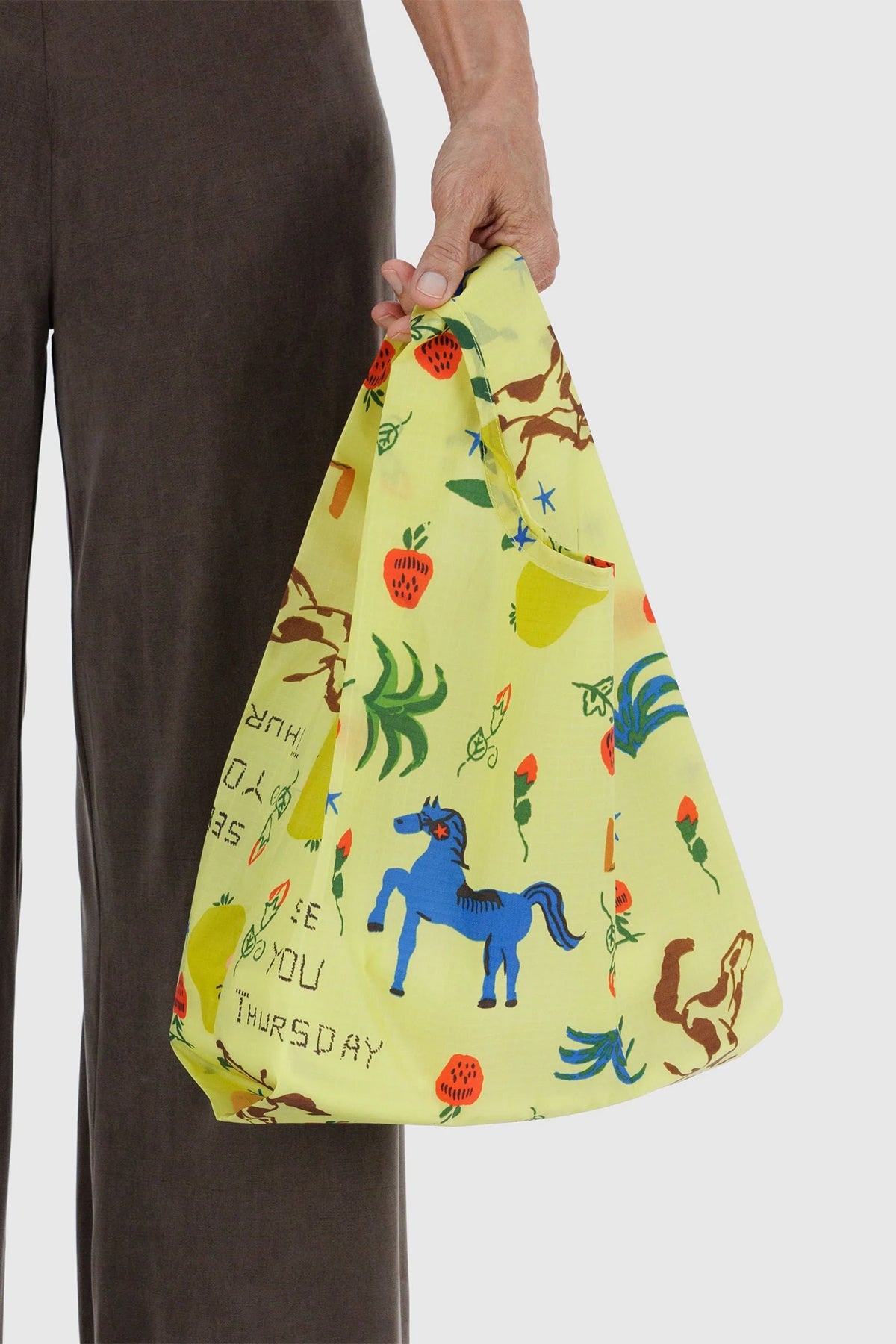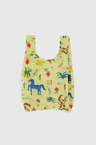 A smaller version of BAGGU's original reusable shopping bag. Perfect for your lunch, a six pack, extra shoes, or a trip to the corner store. A useful loop on its flat-pouch allows you to carry it on your keyring, so you have it when you need it.