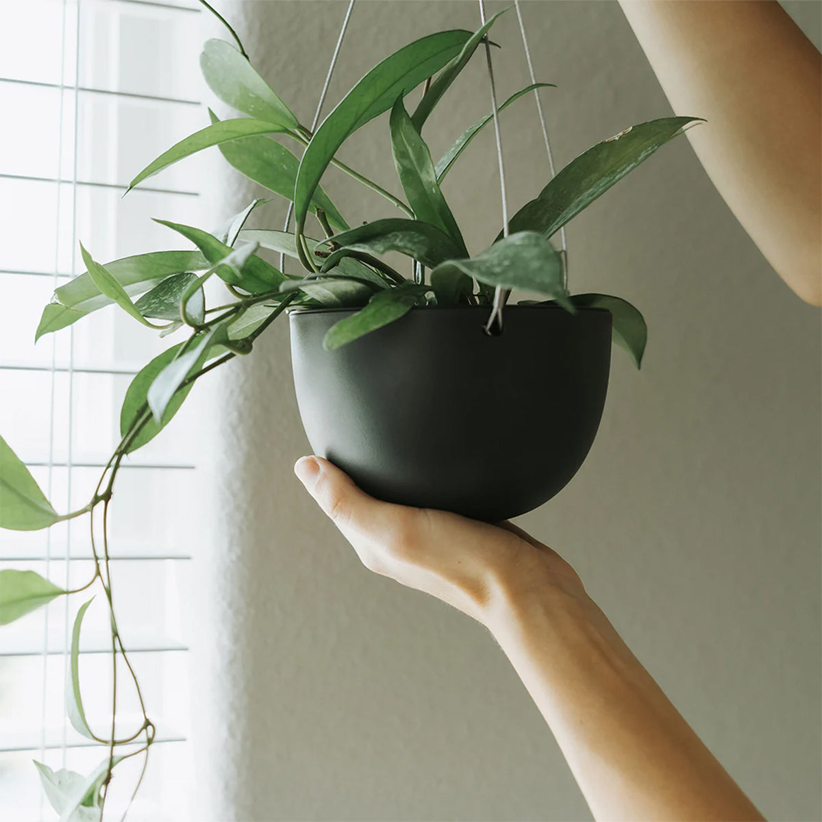 The inner container has a drainage hole which allows water to drain freely and keeps plants healthy. It comes with a sleek, adjustable stainless steel wire for hanging.