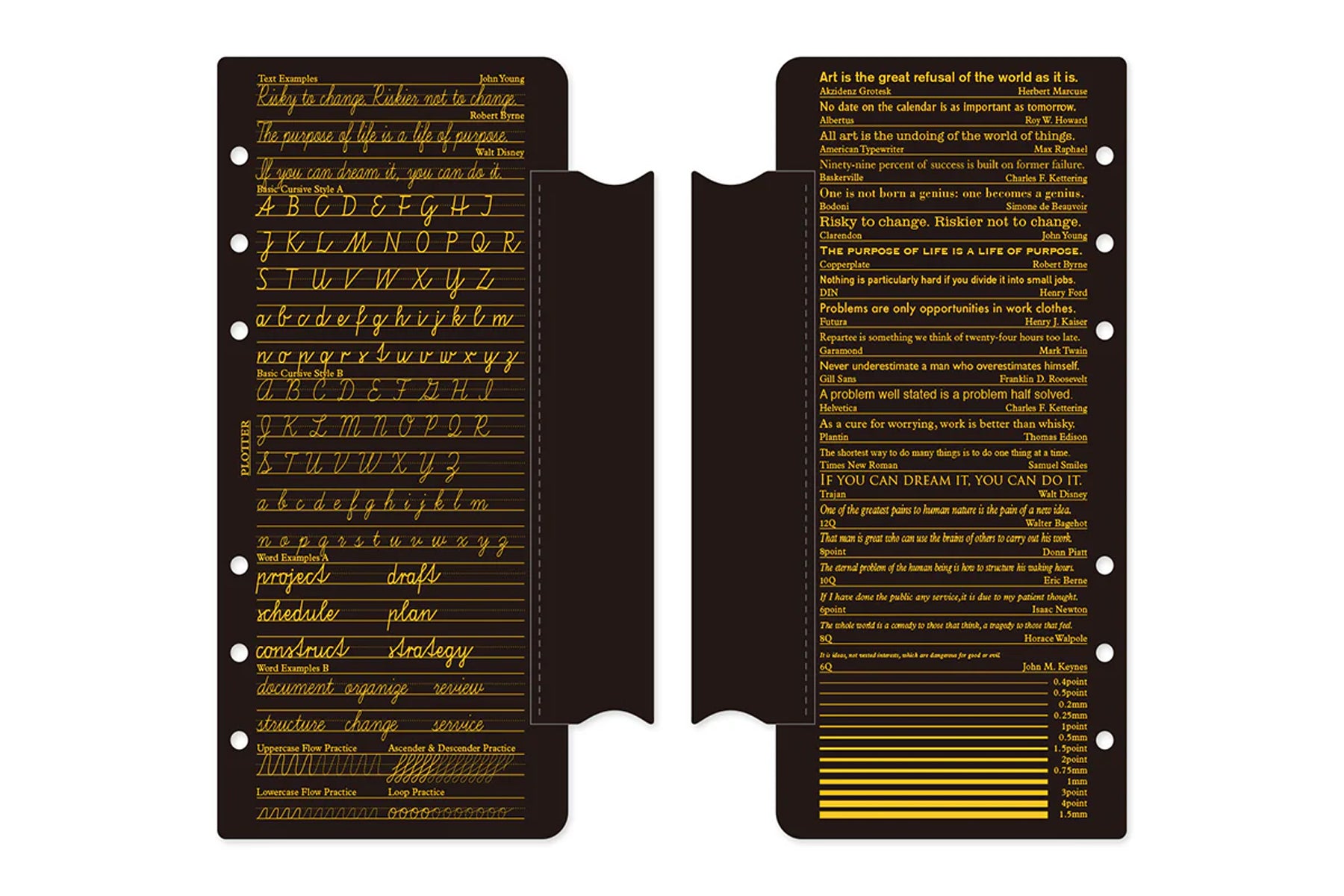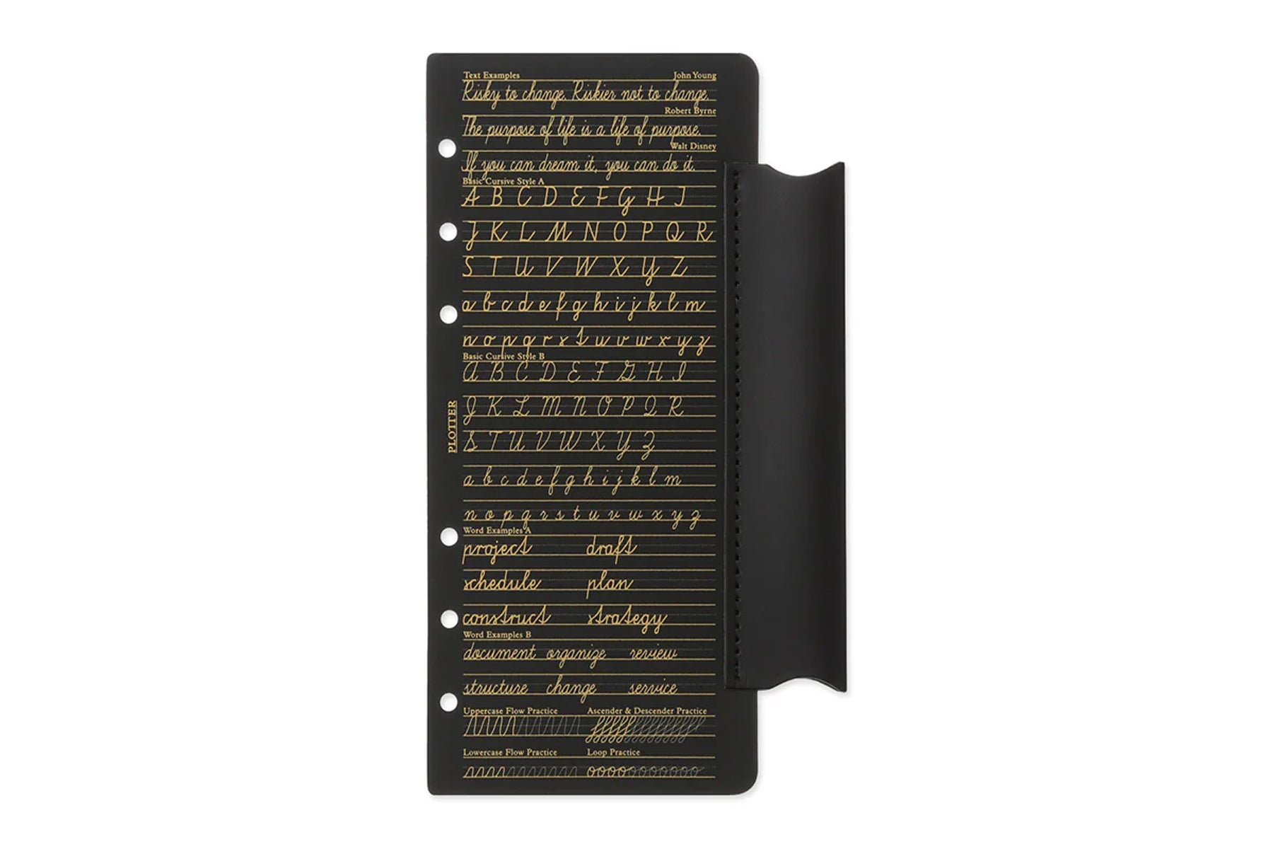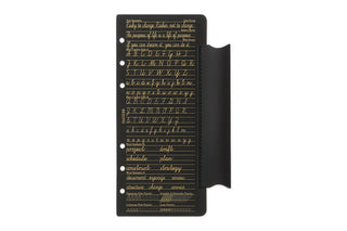 A Lifter with a full-size genuine leather pen holder that securely holds the entire pen. The Lifter is designed with a variety of fonts and calligraphy designs with quotes from famous people to inspire creative writing, all screen printed in matte gold by hand. This multifunctional pen holder also comes with a line width chart. You can protect the refills from the contours of the leather covers by placing Lifters at the beginning and end of the Leather Binder.