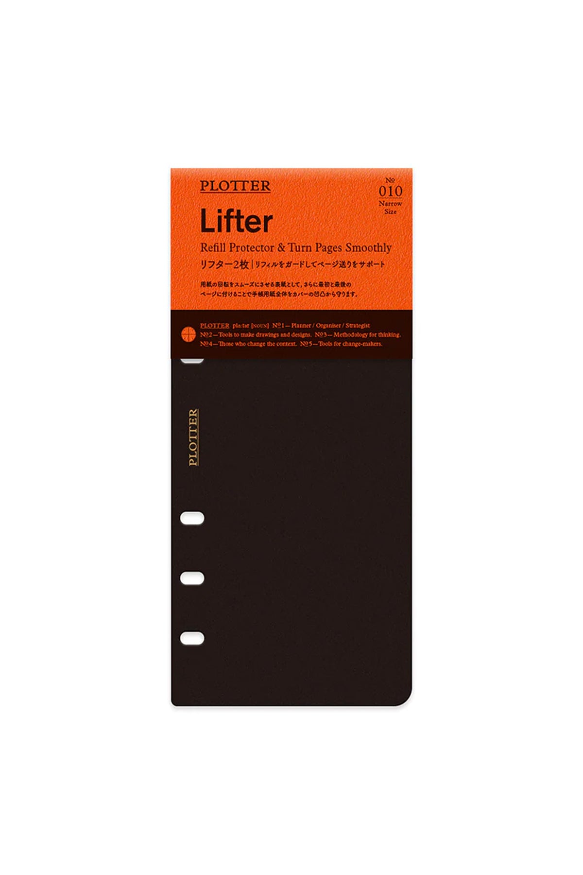 Lifters can protect the refills from the contours of the leather covers simply by placing them at the beginning and end of the Leather Binder. You can also use it as dividers between pages to easily access the section you need. Lifters can also be used as pencil boards because of their smooth and sturdy surface. PLOTTER logo is screen printed in matte gold on each Lifter.