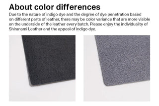 PLOTTER collaborated with a long-established tannery in Himeji to produce “Shiranami Leather”, a leather dyed with natural indigo with a tasteful expression. The leather is infused with a generous amount of white tax. The white waxy bloom on the surface of the leather represents the foamy waves, which gain luster the more you age it. Just like waves, the white wax blooms recede with use, and a hidden indigo-dyed blue surfaces over time.