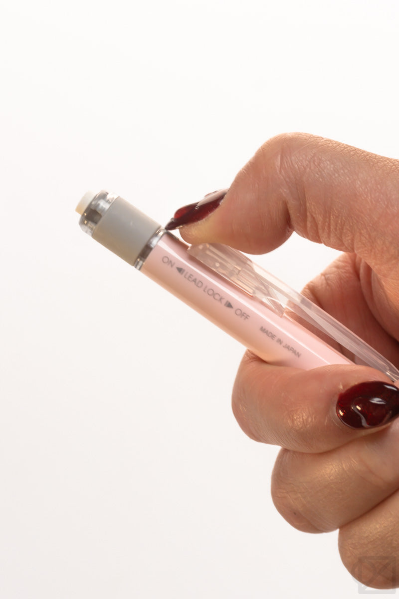 The 4mm long guide pipe supports high precision writing and its shake knock mechanism allows you to advance lead without losing your grip. Just shake the pencil while holding it to feed extra lead into the tip. The pen clip on the side functions as both a secondary lead advancement mechanism (pushed down) or a lead shake lock (pushed up).