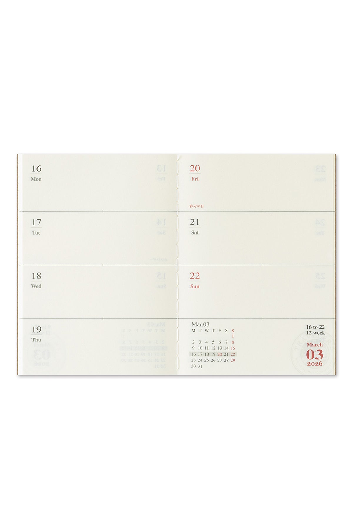 This is 2026 Weekly Diary Refill for TRAVELER'S notebook Passport Size. There is ample space for each day of the week to jot down notes, appointments, or other tasks. It is also suitable for use as a mini diary where you can write down things that happen daily.