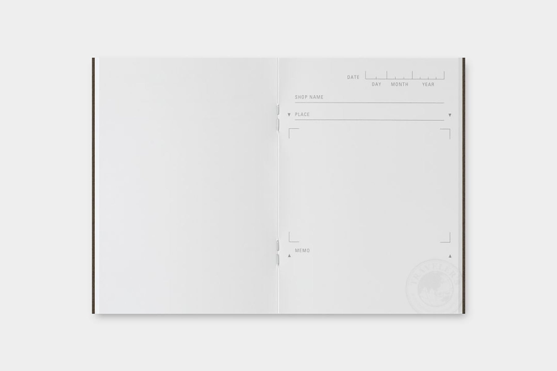 TRAVELER'S has now created a special notebook refill to make collecting PARTNER SHOP stamps even more fun. The passport-inspired cover features the foil-stamped PARTNER SHOP logo. The inner pages use thicker paper to minimize ink bleeding through. Alongside stamp spaces, there are areas to write dates, shop names, and locations.