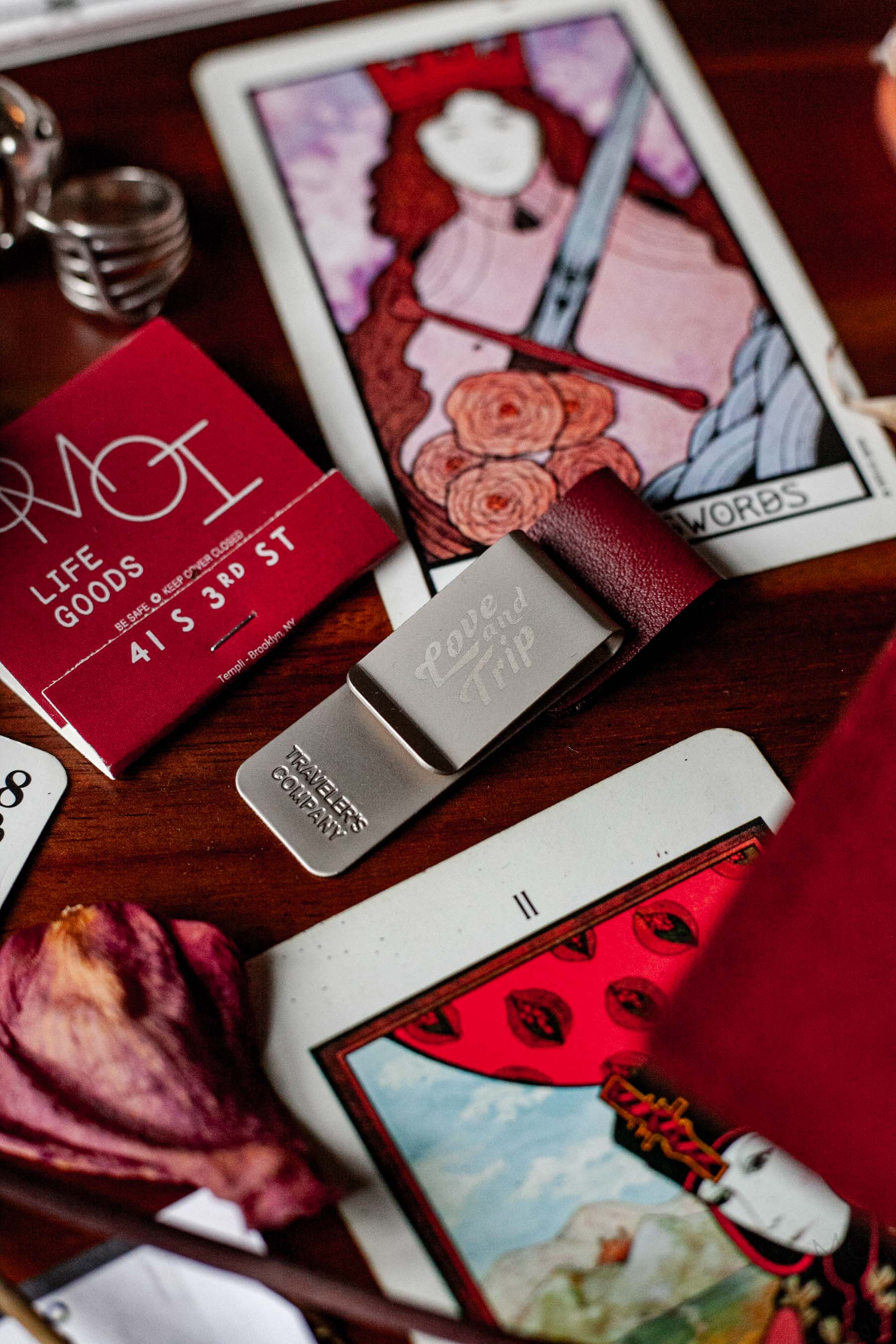 The metal clip is laser-engraved with the LOVE AND TRIP logo and has a red leather holder. Pens up to a diameter of 12mm can be inserted into the holder.